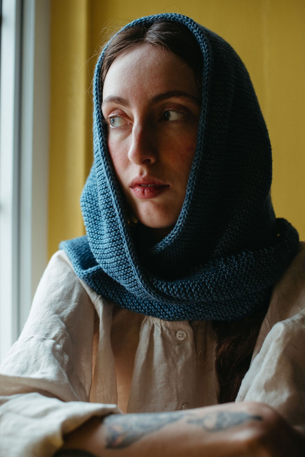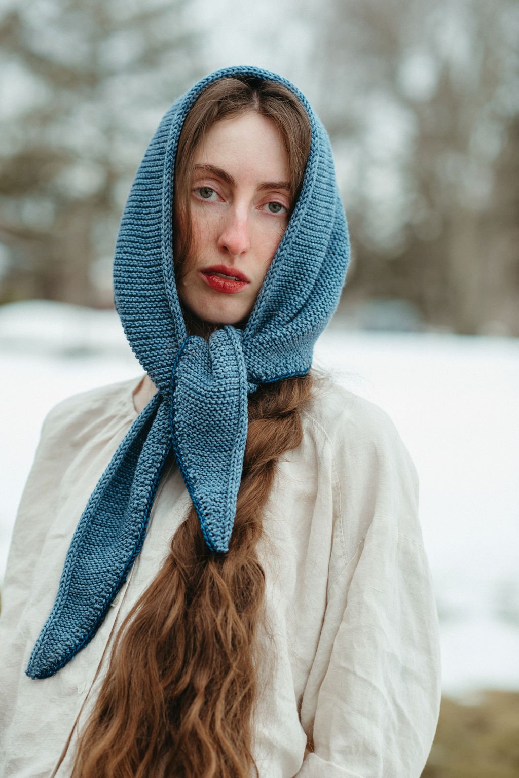 A classic statement piece to complete any look, this kerchief is hand knit with a clean and beautiful i-cord edge, against a garter stitch pattern. This item can be worn in many ways, such as at the neck or as a head accessory.